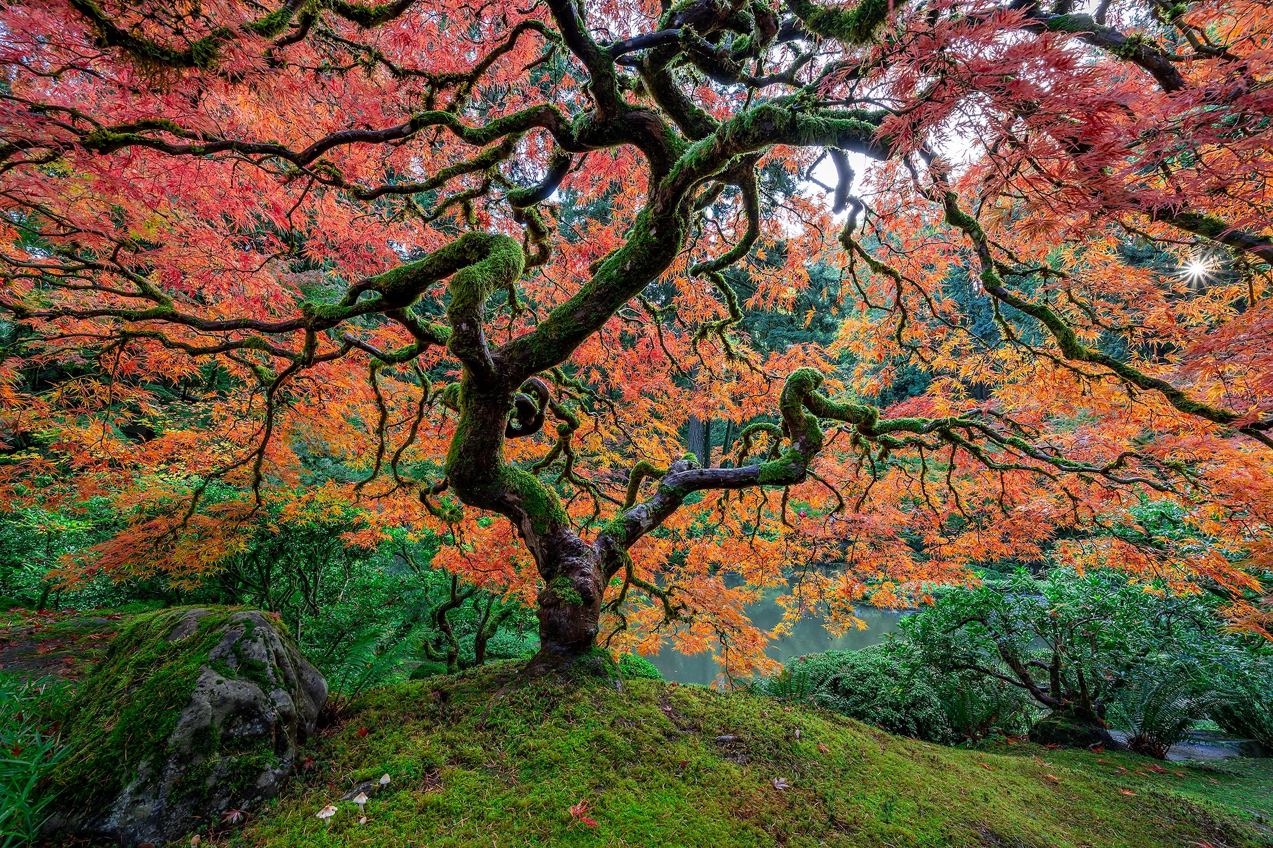 I made my first visit to the gardens in the afternoon and immediately was overwhelmed by the beauty of the landscape and this particular Japanese maple. A few photographers and garden enthusiasts were huddled around the tree capturing the moment as I previewed the scene and began to conceptualize my composition. Once I set up underneath the canopy, the tree’s presence was so much larger and immersive, it was obvious why it had attracted so much attention. The branches seemed to spread out in all directions while the color palette was a literal rainbow of autumn splendor. The saturated bed of moss beneath the tree had sprouted several marvelous little fairy mushrooms making for a scene straight out of a fantasy!