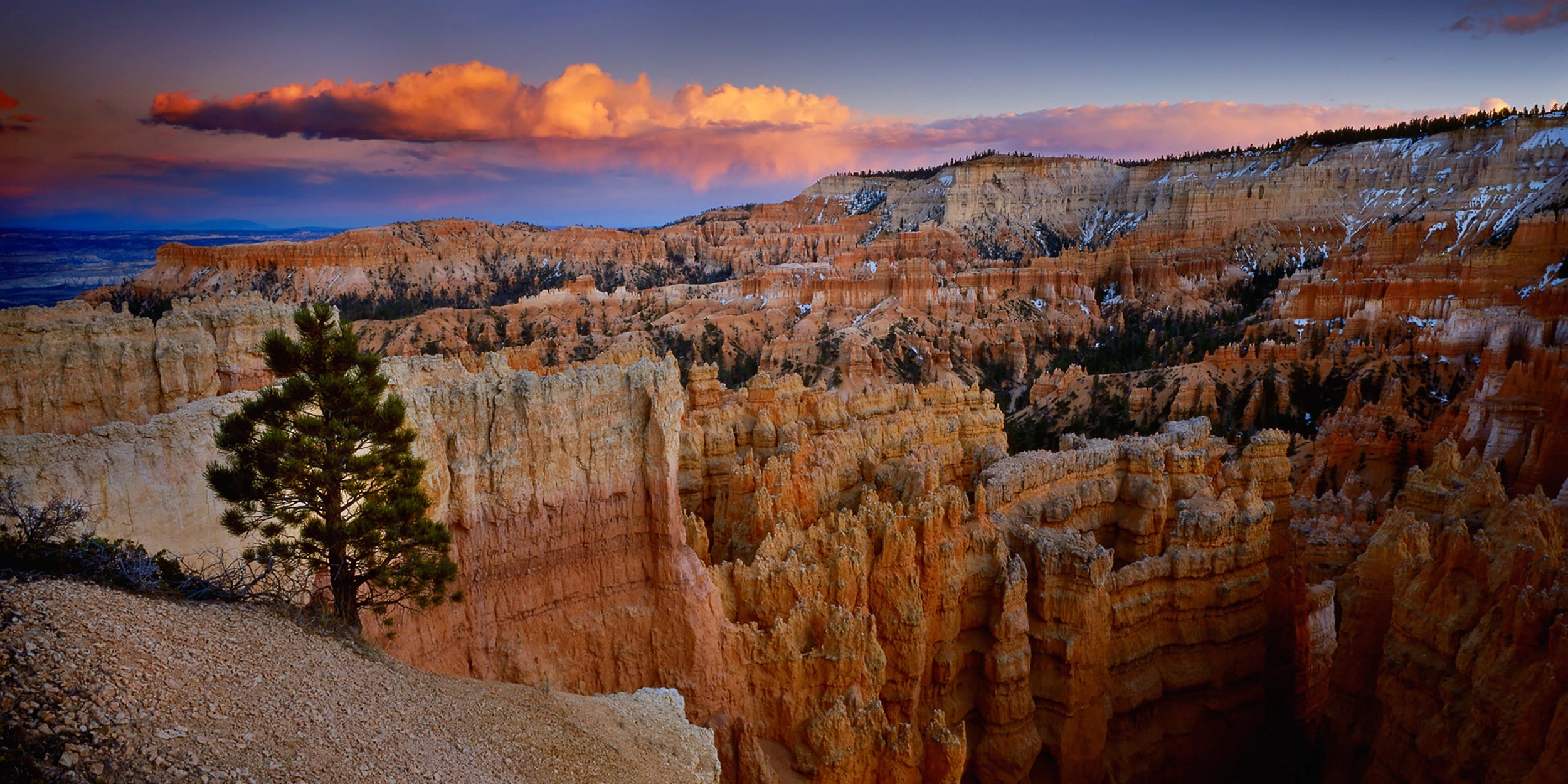 Lingering snow hangs on in the shadows of giant hoodoos that litter the amphitheater of Bryce Canyon. From Inspiration Point I took in this sunset while watching distant thunderheads form on the horizon.